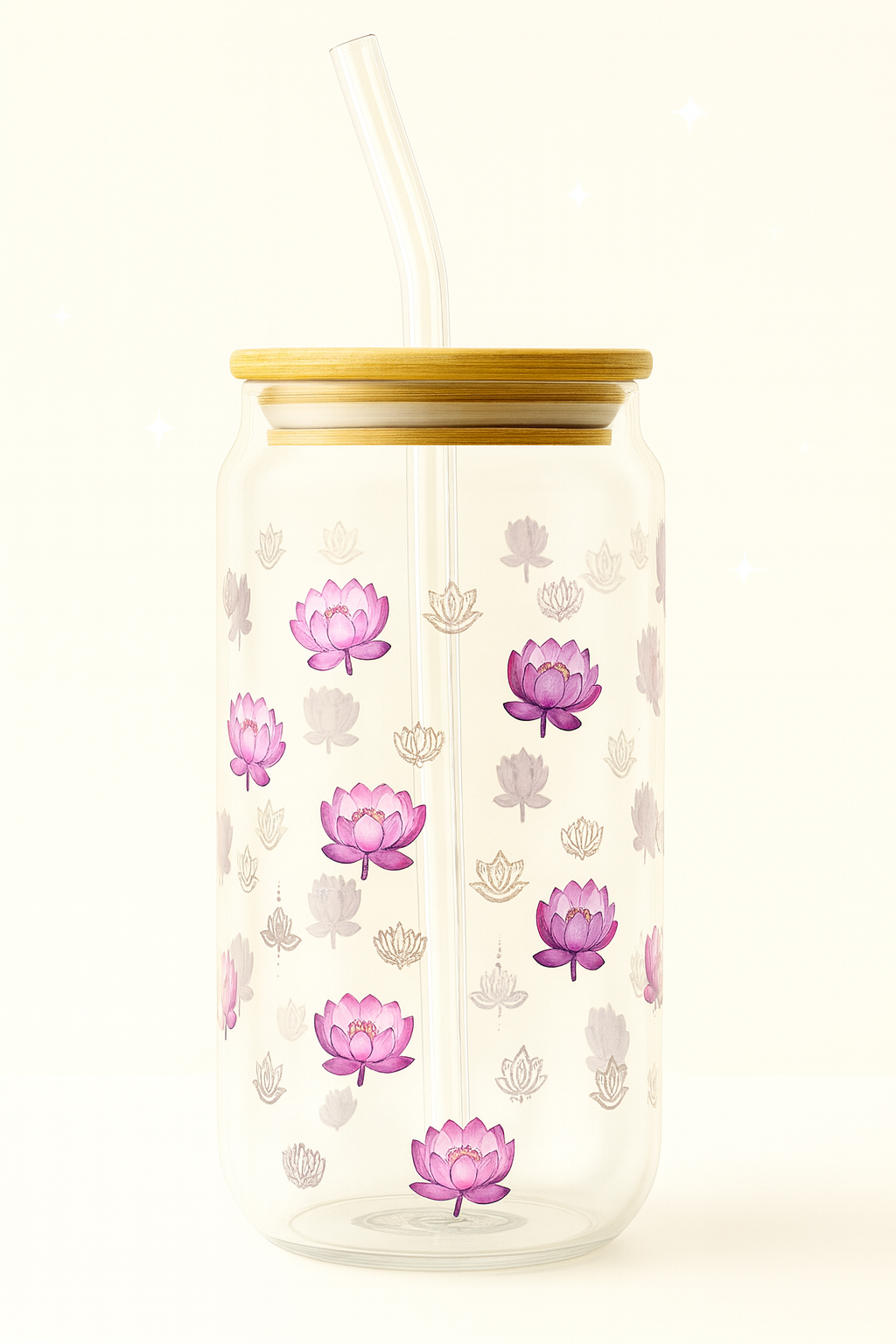A symbol of calm and renewal, this 16oz handmade borosilicate glass is decorated with delicate lotus blossoms in shades of pink and purple. Paired with a bamboo lid and reusable glass straw, it’s perfect for iced teas, matcha lattes, juices, or sparkling water — a touch of serenity in every sip.