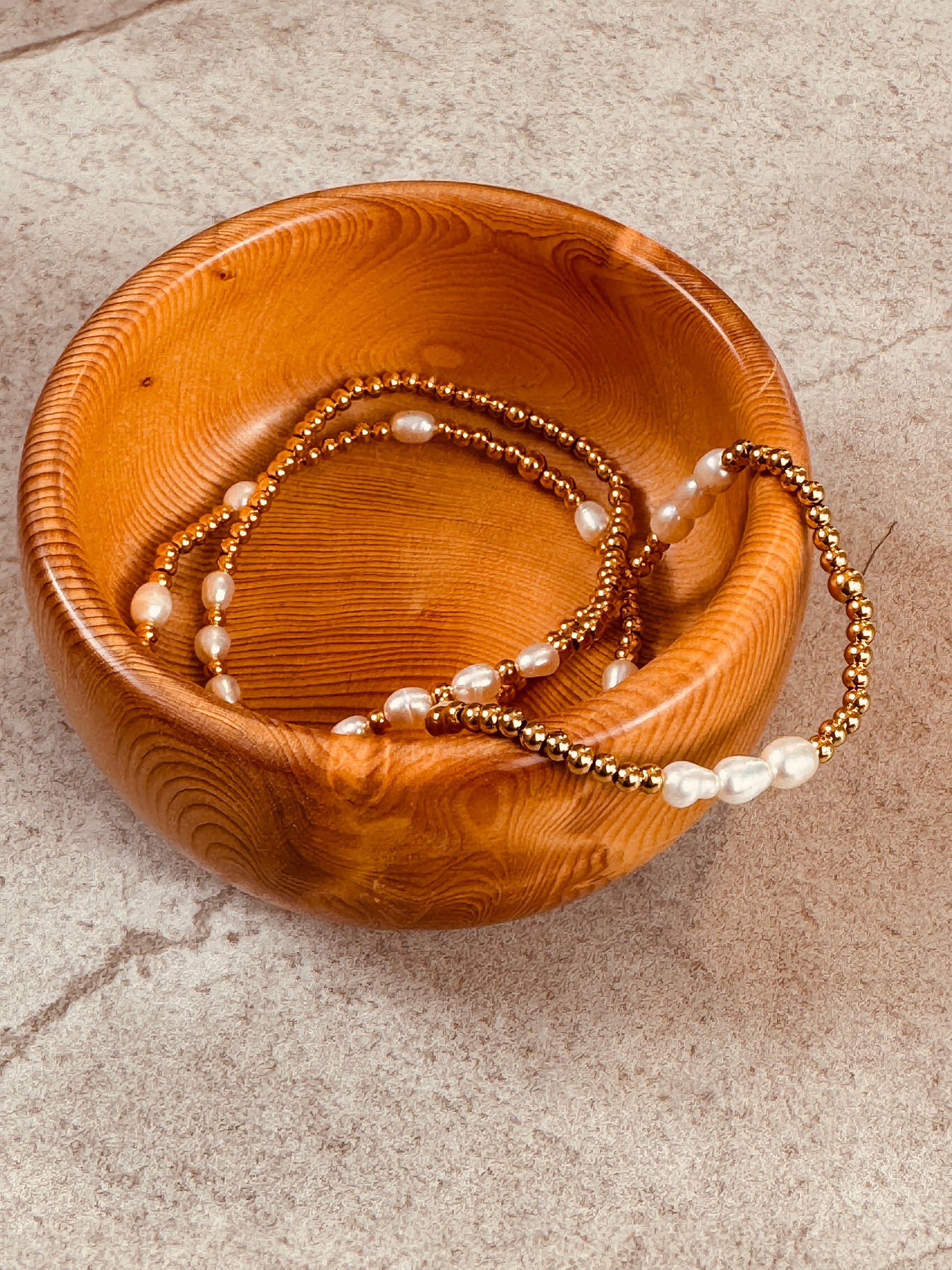 The Serena bracelet features lustrous freshwater pearls paired with 18K gold-plated stainless steel beads in a classic design that never goes out of style. The elastic band makes it easy to slip on and off, while the combination of pearls and gold creates a sophisticated look that works for any occasion.