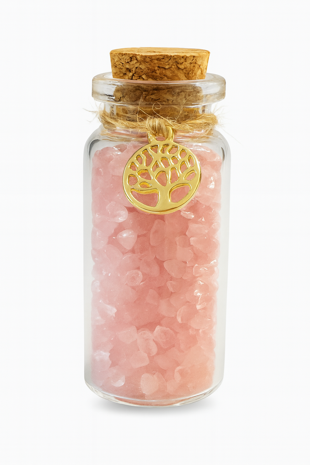 Finished with a petite glass bottle of natural rose quartz, chosen for its calming and heart-opening energy, making this gift even more meaningful.